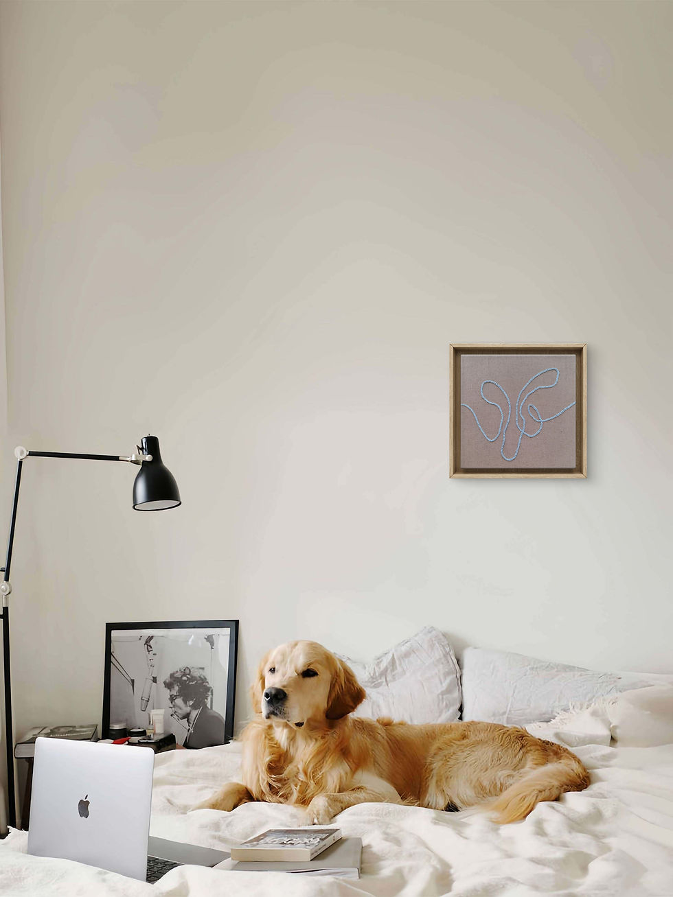 This larger abstract embroidered artwork is hand-stitched on natural linen in a soft lavender-grey tone. Using ultra-fine, semi-dark purple thread, the airy composition opens up across the fabric, creating a light and spacious impression. The flowing pattern can resemble wings in motion, or perhaps the quiet presence of a bird, leaving the interpretation open to the viewer. Calm, elegant, and gently expressive, this textile art piece brings a sense of lightness and harmony to any space.